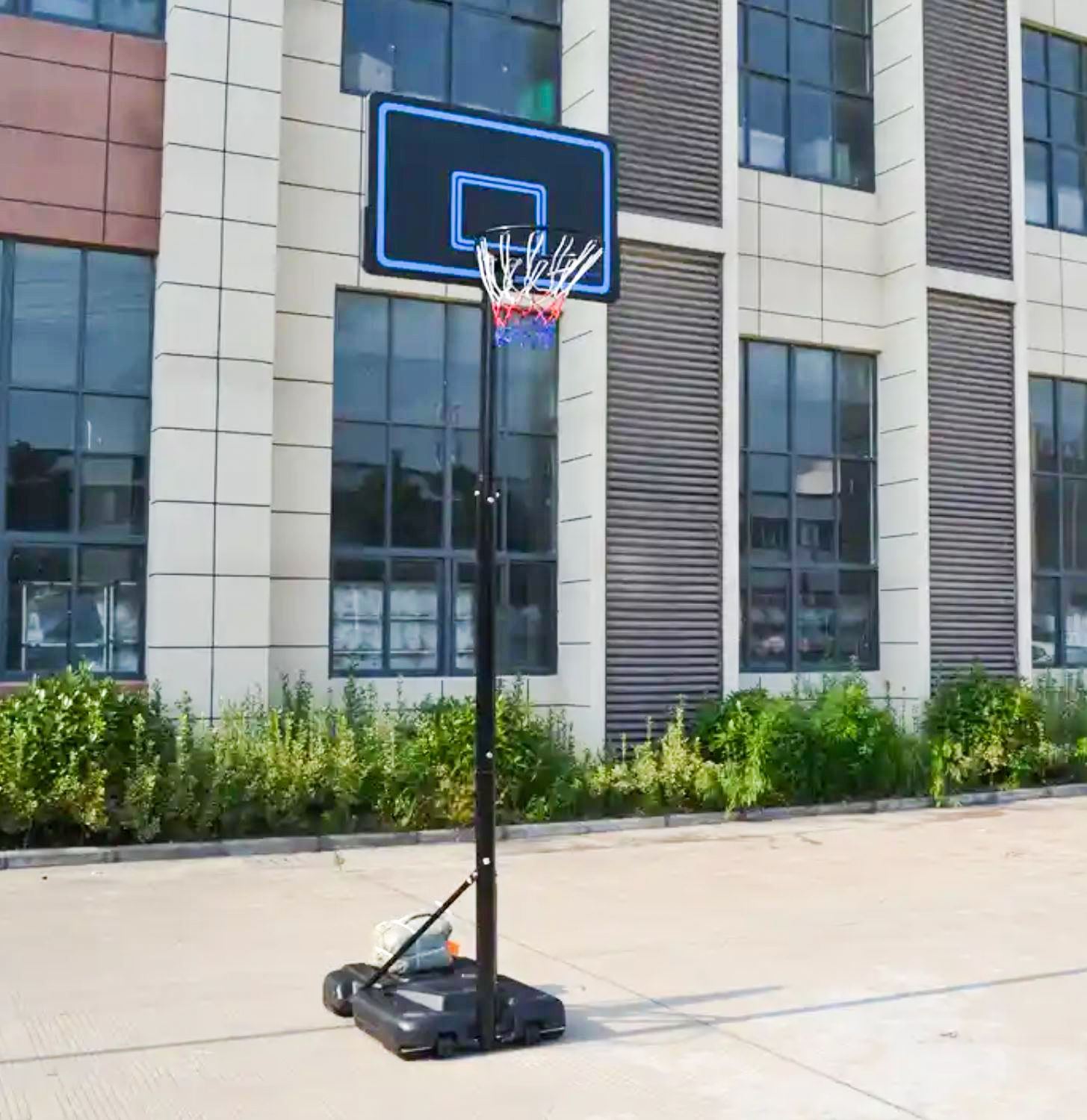 The base can be filled with water or sand to provide added stability during use. Built-in wheels allow the hoop to be moved easily between locations such as driveways, backyards, or indoor courts.