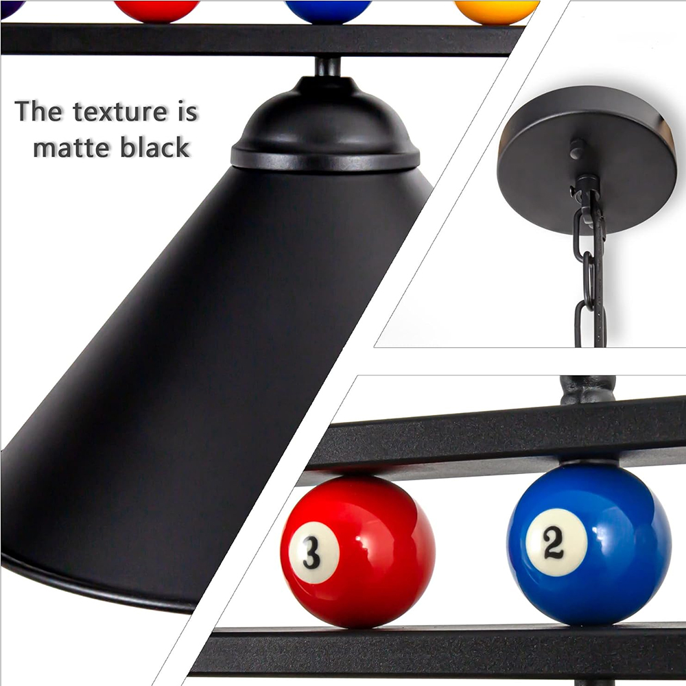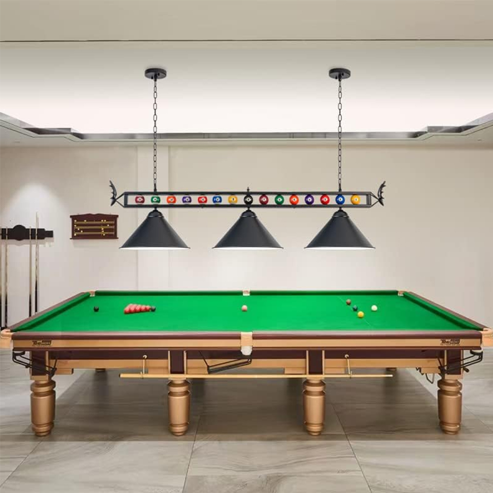 The billiard light is constructed with three individual lamp shades, helping minimize shadows on the playing surface. This design allows clear visibility of all balls and pockets, supporting focused and uninterrupted gameplay.