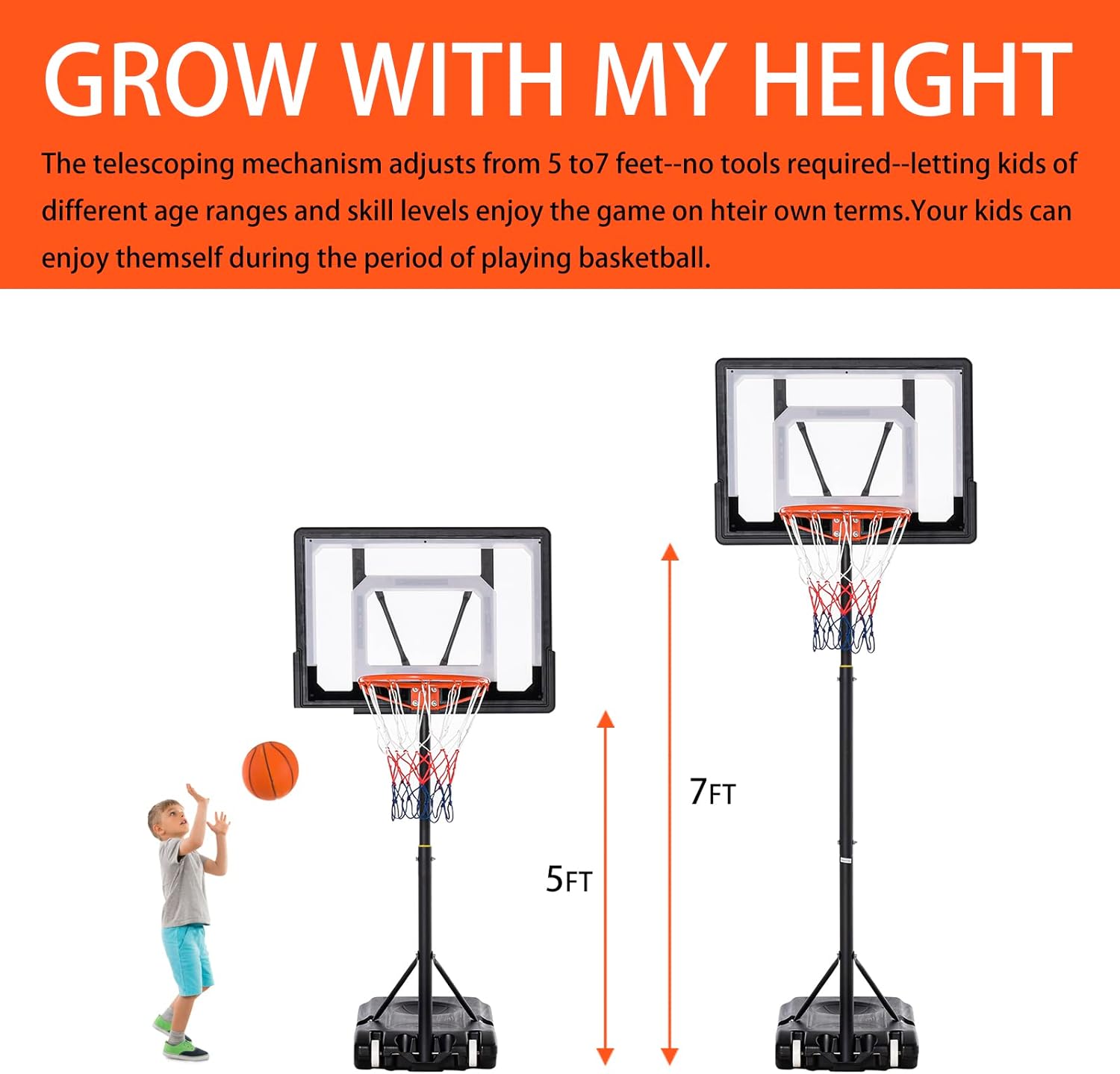 This portable basketball hoop features built-in wheels for easy movement and an adjustable height from 5ft to 7ft. With a durable polycarbonate backboard, rust-proof steel pole, and fillable heavy-duty base, it offers stable indoor and outdoor play.
