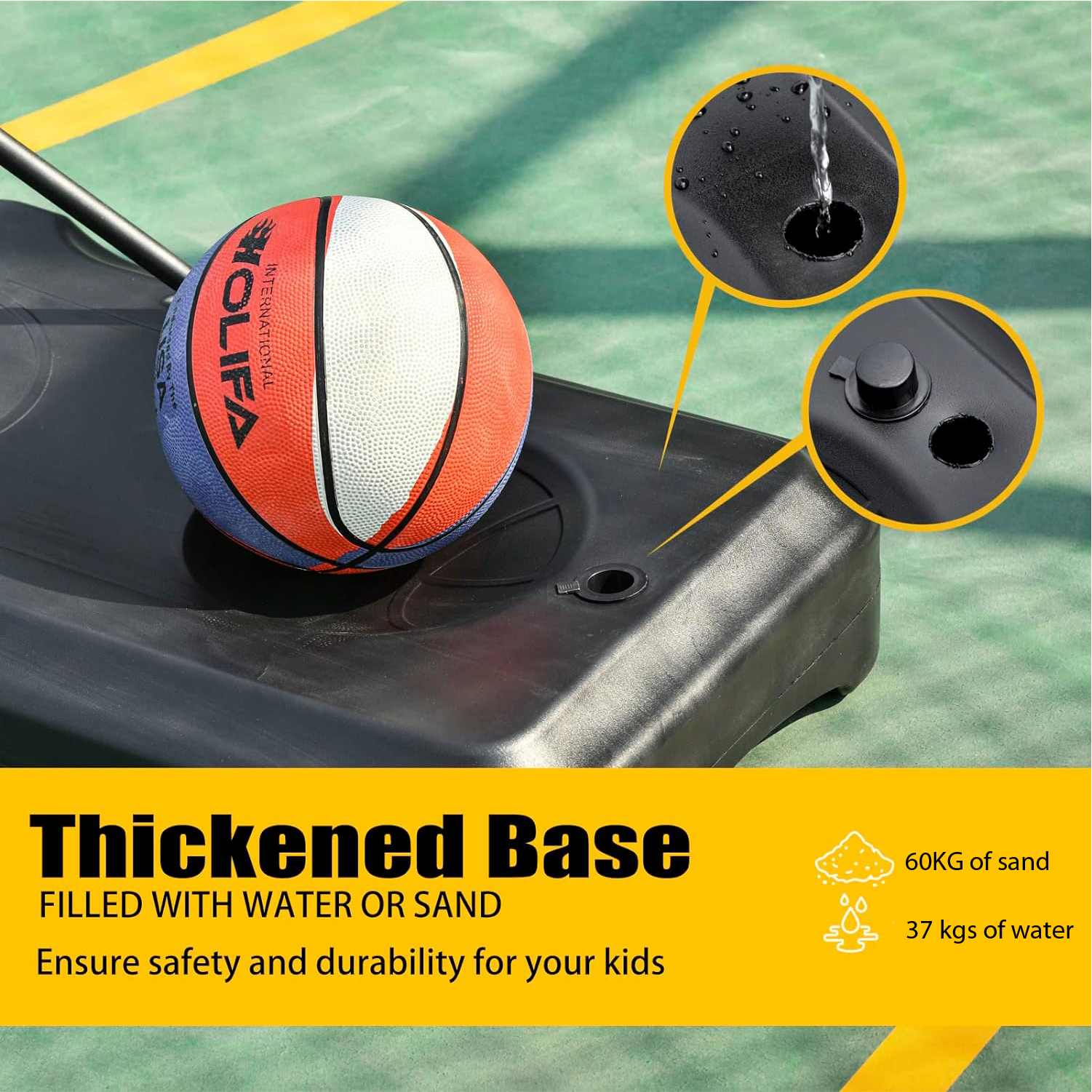 The extra-large base features a triangular support structure for added stability. It can be filled with water or sand to help reduce movement during play, providing a safer experience for children.