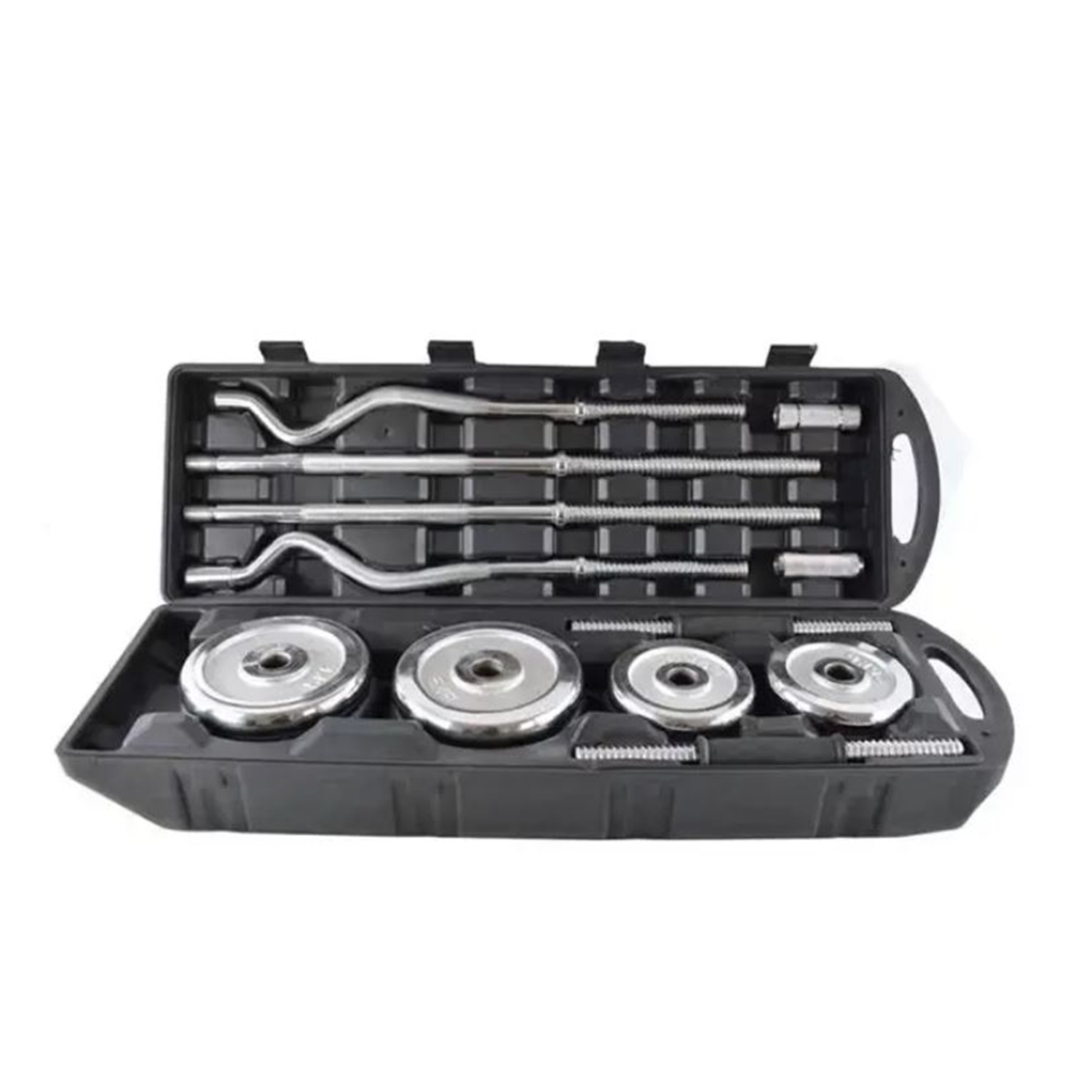 Fitness equipment combo includes chrome weight plates, dumbbell handles, curl & straight barbell with connector and collars. Adjustable set offers durability and quick weight changes. Compact, easy to store, and ideal for versatile strength training. Total weight: 55KG (carry case included).