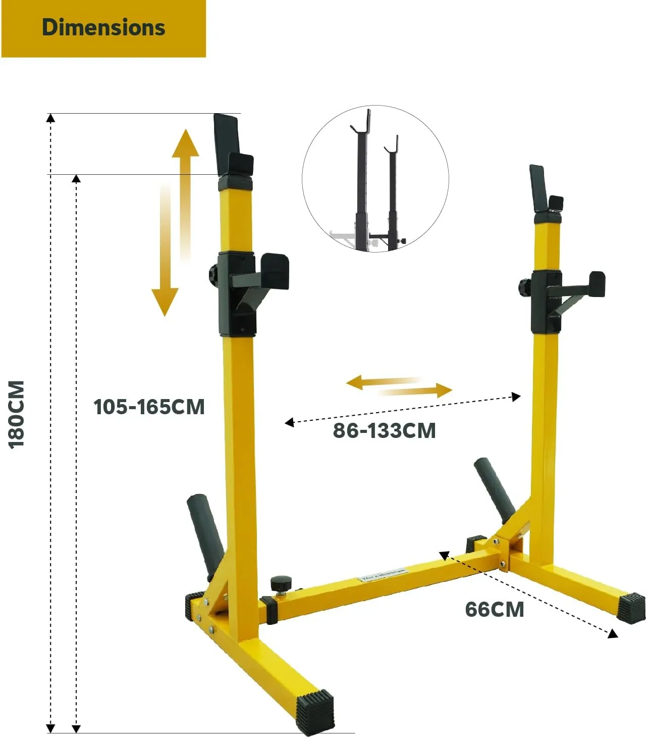 The rack features adjustable height and width to accommodate different body types and exercise setups. The height adjusts from 105cm to 180cm, while the width adjusts from 86cm to 133cm, allowing flexible positioning for multiple training needs.