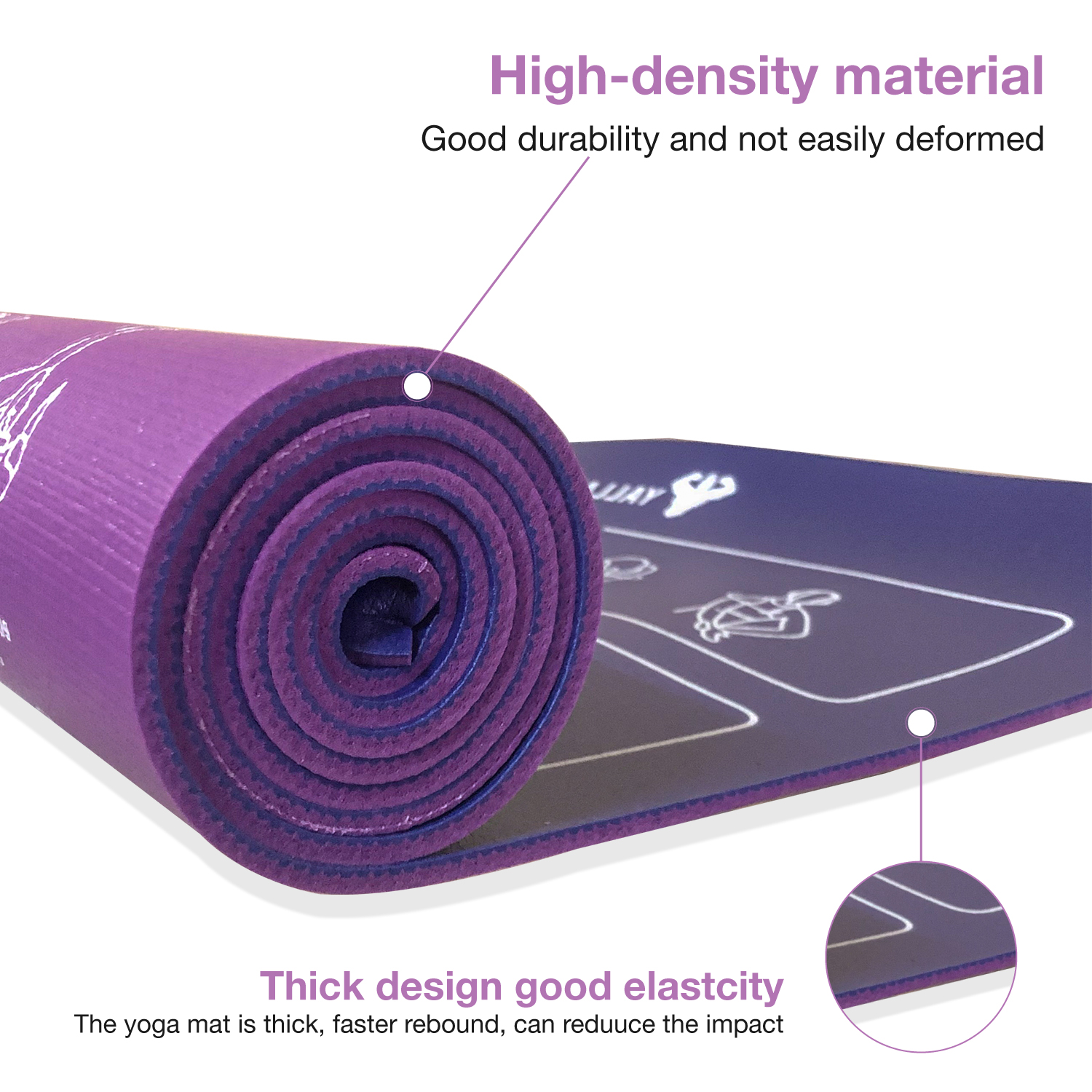 6mm thick yoga mat made from high-density, odor-free PVC for comfortable, joint-friendly workouts. Features a textured non-slip surface and double-sided prints with 75 yoga poses and 75 stretches. Includes a mesh carry bag, size 174×62×0.6cm, blue/purple.