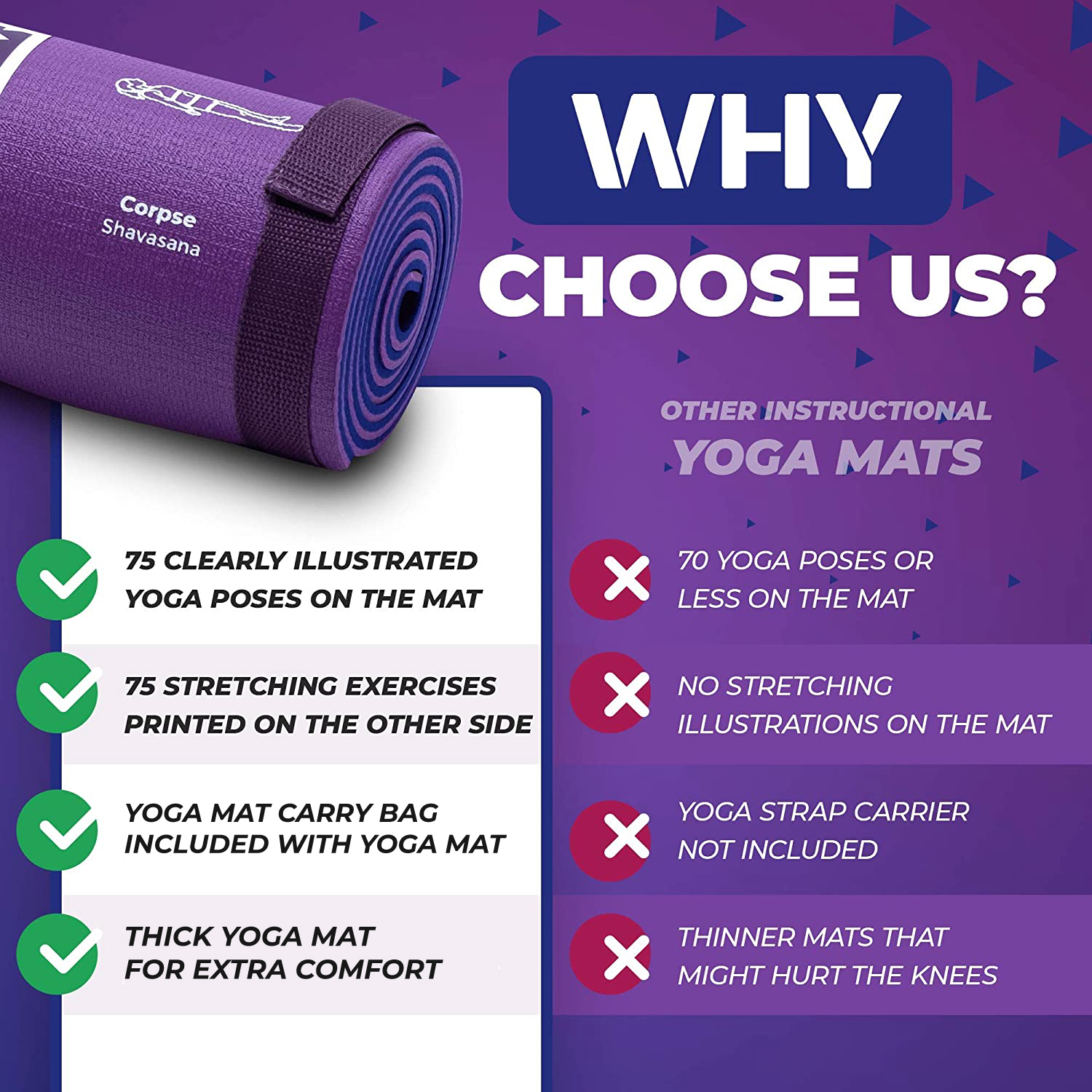 YOGA & STRETCHES EXERCISES: Our Yoga mat is fully customized with both sides (75 Yoga Positions & 75 Stretches) printed positions which guides you to do perfect exercises at home without any further guidance by any coach or trainer.